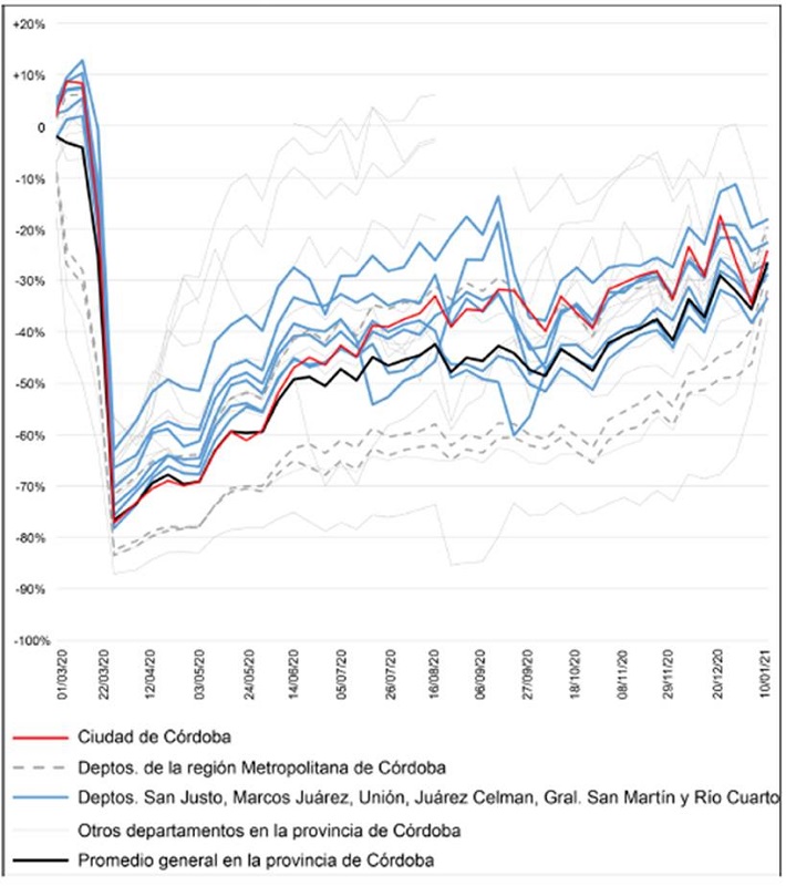 Solo permaneció como zona roja a la RMCba, donde se mantuvieron algunas restricciones, y algunas localidades como Río Cuarto y Villa María, donde se constató circulación comunitaria del virus. Sin embargo, a raíz de crecientes conflictos con personas afectadas en estas localidades, principalmente del rubro gastronómico y el comercio minorista -que en algunos casos contaban con el apoyo de los gobiernos locales (Corresponsalía, 2020)-, el gobierno provincial decide que, a partir del 1° de septiembre de 2020, las medidas sanitarias que el COE considere para cada localidad serán implementadas según el criterio de cada gobierno local. A raíz de esto, varias localidades flexibilizan el DISPO prácticamente hasta alcanzar una situación pre-pandemia, regularizando una situación que existía de hecho en numerosas localidades de la región estudiada (Ferreras, 2020). La Figura 5 muestra que los departamentos de la región (en azul) redujeron su movilidad significativamente menos que el promedio provincial; hasta la primera semana de julio, la región analizada redujo su movilidad incluso en menor medida que la ciudad de Córdoba (en rojo) y su región metropolitana5.
