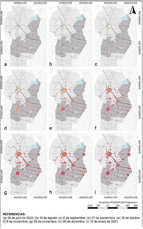 Pocas semanas después (desde mediados de agosto) se multiplicaron los brotes de contagio en las localidades de la región, como puede verse en el Video 1 (la Figura 6 muestra una secuencia resumida de estos datos). No solo se recrudecen los brotes que parecían controlados (Tío Pujio, Río Cuarto, Berrotarán, General Deheza y General Cabrera), sino que además hay nuevas localidades afectadas (Los Surgentes, Monte Buey, Marcos Juárez, Luca, Carnerillo, Bulnes, Coronel Baigorria y Coronel Moldes). Frente a esta situación, las autoridades locales repiten que el virus es una amenaza externa, y el foco está puesto en "trabajar para evitar que el virus entre". Sin embargo, al multiplicarse los brotes, cunde la visión de que, al interior de cada localidad, "todos nos relacionamos con todos, en los mismos lugares. No hay responsables ni culpables. Es una cuestión biológica, que se escapó de control" (Jefa de la Comuna de Los Surgentes, cit. en Ferreras, 2020); "por una cuestión idiosincrática, cultural, propia del pueblo pequeño, donde es normal que una persona tenga vínculos con toda la población" (Intendente de Bulnes, cit. en Audrito, 2020). Los casos de personas contagiadas fuera de la región que regresaban y producían brotes localizados pronto dieron lugar a contagios generalizados por circulación comunitaria del virus, haciendo cada vez más difícil contener su difusión.