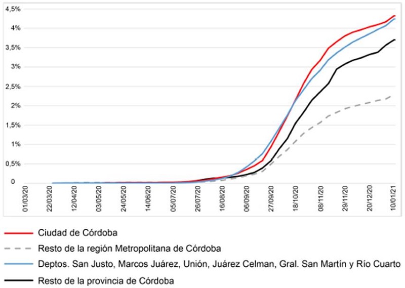 Esta tendencia se observa, por ejemplo, en centros mineros de Sonora y territorios agrícolas de Baja California, en México; en regiones mineras de Oruro y Potosí (Bolivia), donde la explotación de Cerro Chico debió interrumpirse por primera vez en 475 años; en territorios sojeros en Santa Cruz (también en Bolivia) y en regiones de cultivo de café, cacao, palma aceitera y Stevia rebaudiana en Ucayali y San Martín (Perú); en áreas dedicadas a la extracción de caucho, chicle y madera en el Amazonas colombiano; en regiones de producción de caña de azúcar, frutas y extracción minera en Bahía, Alagoas y Pernambuco (noreste de Brasil); y en la región pampeana dedicada a la producción extensiva de soja, carne y leche vacuna en Córdoba (Argentina) -territorio del que se ocupa en detalle este trabajo-. Los registros oficiales de cada país relevan brotes tempranos y muy intensos de contagios en estas regiones -comparables a los de regiones metropolitanas-, sobre todo en territorios próximos a las redes de transporte hacia puertos internacionales donde esas mercancías parten a Europa, Estados Unidos y Asia1.