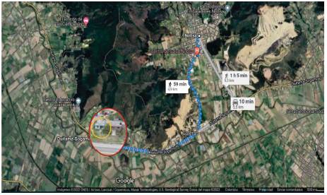 Como se observa en la Figura 2, la ubicación geo gráfica de la vivienda de ocurrencia de los hechos re latados en la historia de vida está en la zona rural del municipio de Nobsa y tiene una relativa cercanía al centro poblado. Así mismo, se observa que el paisaje que rodea la vivienda hace referencia a vivienda tipo campesina, en cuyos alrededores se desarrolla la pro ducción mineral de cal.