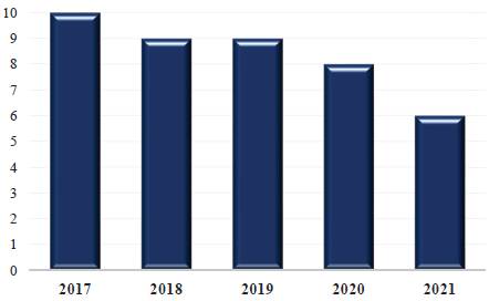 En el departamento de Boyacá, entre el 2017 y el 2021, según se observa en la Figura 3, se reportaron 42 casos, una cifra menor en comparación con otros departamentos del país que en lo corrido del periodo han encabezado la ocurrencia de feminicidios en Co lombia. A este escenario se suma que existen algunas dinámicas vinculadas con la violencia intrafamiliar que podrían agravar la situación, como se mostró en los datos anteriores, y que deben atenderse de manera acertada dado que, como se ha mencionado a lo lar go del artículo, son alarmas tempranas del riesgo a la integridad de las mujeres y las niñas.