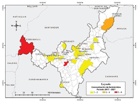 A partir de la información secundaria recolectada en los diversos medios oficiales que relatan la ocurren cia de feminicidios en el departamento de Boyacá, se presenta el siguiente mapa (Figura 4) que revela los datos para el periodo 2017 a 2021.