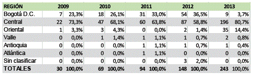 De manera particular, los graduados y graduadas de la Maestría en Educación de la Universidad del Tolima se desempeñaron, durante los años de análisis, principalmente en la región central del país constituida por los departamentos del Tolima, Huila, Quindío y Caldas, con alta concentración en el departamento del Tolima, como es de esperarse, dada la condición de la Universidad del Tolima como institución de carácter regional. Es importante mencionar que entre los años 2009 y 2012, la capital del país ocupó un importante número de graduados y graduadas de la maestría; sin embargo, el porcentaje de vinculación disminuyó considerablemente, pasando del 36.5% en el año 2012 al 3.7% en el 2013, diferencia que se trasladó al departamento del Tolima, donde la vinculación aumentó del 58.8% al 80.7%, y en la región oriental donde el porcentaje de vinculación ascendió del 1.4% al 14.4%.