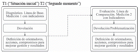 Descritas las etapas del M.O (ver figura 1), es relevante señalar que la etapa de "definición de orientaciones, acciones, y compromisos para mejorar la gestión y resultados", da pie a la primera etapa de T2, en la que se obtiene valores para medir los mismos componentes y sus dimensiones e indicadores, utilizando las mismas técnicas que en T1. En esta primera etapa de T2 realizamos una medición y comparamos los valores con T1, evaluando el impacto del M.O y buscando responder interrogantes que planteamos en el presente estudio: ¿cómo gestionan y operan territorialmente las redes sociales?, ¿qué fortalezas y debilidades existen en estos procesos? y ¿qué características tienen dichas redes?