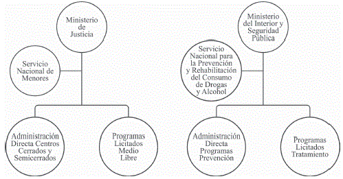 Los participantes en la investigación fueron actores de los Programas RPA de medio libre del Consejo de Defensa del Niño, y actores relevantes para los procesos de readaptación y reinserción social de los sujetos adolescentes infractores de ley (Sename y Senda) de la Región de Los Ríos. Para contextualizar los niveles jerárquicos y las dependencias administrativas de los individuos participantes, brevemente señalamos que el Sename es un organismo gubernamental centralizado, colaborador del sistema judicial y dependiente del Ministerio de Justicia. Para su labor, el Servicio cuenta con centros de privación de libertad de administración directa y con una red de colaboradores acreditados para la administración de medidas no privativas de libertad, que postulan a licitaciones públicas, las que, una vez adjudicadas, les permiten implementar programas como el SBC, PLA y Plae antes reseñados. Por su parte, el Senda, radicado en el Ministerio del Interior y Seguridad Pública, es la entidad responsable de elaborar las políticas de prevención del consumo de drogas y alcohol, mediante la administración directa de programas de prevención, así como de programas licitados de tratamiento, rehabilitación y reinserción social ejecutados mediante convenio de colaboración técnica y de transferencia de recursos para programas de adolescentes infractores de ley. Sintetizamos en la figura 2 la organización administrativa señalada:
