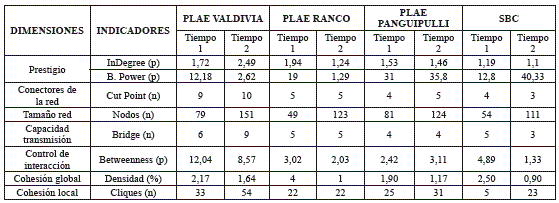Como lo indicamos en la figura 1, respecto al componente "estructura y vínculos de la red", específicamente, en relación con la dimensión "prestigio", observamos un aumento en el promedio del indegree en el Plae Valdivia en T2, lo cual contrasta con el resto de los programas, en los cuales disminuyó el promedio de indegree en T2 respecto a T1. El promedio del B. Power se redujo en el Plae Valdivia y Ranco, y se incrementó en Plae Panguipulli y SBC.