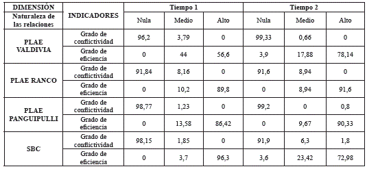 A partir del análisis de la dimensión "naturaleza de las relaciones", podemos señalar que en el Plae Valdivia hubo una disminución en T2 respecto al indicador de conflictividad, y un aumento en el grado de eficiencia. En Plae Ranco, el indicador grado de conflictividad se mantuvo sin diferencias significativas, lo cual difiere con el grado de eficiencia, donde se observó un aumento en T2 y una disminución de la percepción de mediana eficiencia. En el Plae Panguipulli se redujo el grado de conflictividad. En el programa SBC aumentó la percepción de conflicto y la percepción de ineficiencia. Resumimos lo señalado en la tabla 2: