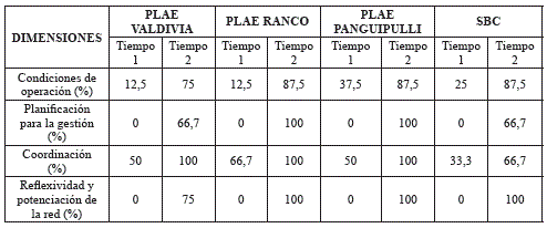 Respecto a la dimensión "reflexividad y potenciación de la red", tres programas lograron un 100% de los indicadores de T2 respecto a T1, cuando los programas no presentaban ningún indicador favorable. El programa Plae Valdivia tuvo un 75% de los indicadores favorables, siendo el indicador "existencia de generación de conocimiento a partir de los propios actores" el que no se cumplió en T2, lo que puede explicarse por la gran cantidad de funcionarios del programa en relación con los otros programas del estudio, lo cual implica mayores niveles de coordinación para el logro del indicador.