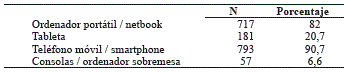 Y el dispositivo preferido para la conexión es el teléfono inteligente (90,7%, n=793) seguido de los ordenadores portátiles (82%, n=717). (tabla 4)