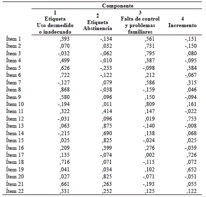 Cuatro factores fueron extraídos del análisis factorial (método de extracción: análisis de componentes principales; método de rotación Promax con Kaiser con un valor para kappa de 4, que permite que los factores estén correlacionados). El primero explicaba el 33,67% de la varianza y se componía de los ítems 4, 5, 6, 8, 9, 18, 21 y 22 del cuestionario final. Teniendo en cuenta su contenido este primer factor fue etiquetado como uso desmedido o inadecuado, ya que se refieren a un uso por encima de lo deseado y, en ocasiones, para superar la soledad o el aburrimiento.