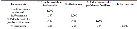 La tabla 7 muestra la correlación entre los cuatro factores extraídos.