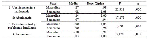 Con respecto al sexo, se aprecia (ver tabla 8: análisis de varianza Anova de un solo factor) diferencias significativas en los factores 1 y 2, teniendo las mujeres más dependencia que los hombres a los teléfonos móviles. En comparación con los hombres, las mujeres hacen un uso de ellos por encima de lo deseado y, en ocasiones, para superar la soledad o el aburrimiento y, por otra parte, manifestando inquietud ante la posibilidad de no disponer de teléfono.