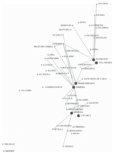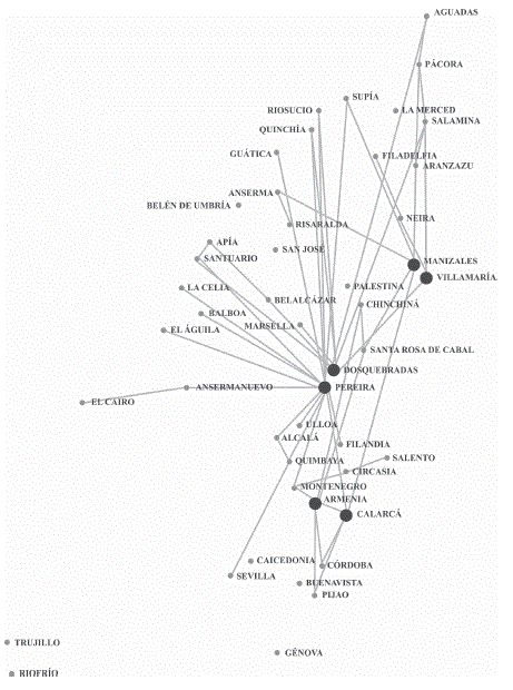 Sin duda, Pereira y Dosquebradas forman el área protagonista de concentración de migrantes de toda la región del PCC donde se han trazado rutas con altos volúmenes de movimientos de población y son un nodo de atracción por las condiciones de intercomunicación y proximidad geográfica con muchos municipios que integran el territorio. Igualmente, se destaca la relevancia de Dosquebradas, Villamaría, Circasia y Calarcá como municipios satélite de las ciudades capitales del PCC que contribuyen a la contracción poblacional de la región en un proceso de descongestión y ampliación periférica que explica casos de perdida poblacional de las capitales4 y los flujos netos de población que sugieren un estado de integración metropolitano, que se advierte en la localización de la industria y la dinámica de la construcción de vivienda. En la siguiente gráfica (Gráfica 2) se observa la red migratoria de acuerdo con los sociogramas que indican las rutas de migrantes en las que se consideran las magnitudes y sentidos de los flujos más importantes: