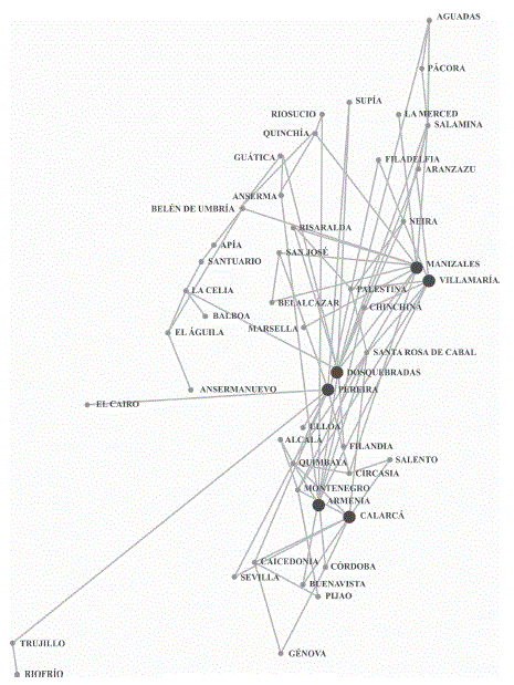 Aunque las Capitales (Manizales, Pereira y Armenia) son muy fuertes en la concentración poblacional, también se advierten elevados flujos de emigrantes hacia otros distritos urbanos del país como Bogotá, Medellín y Cali. Entre tanto, los municipios intermedios que más se destacan por su dinámica migratoria se pueden clasificar según los flujos y sentidos en cuatro tipologías: 1) los ganadores de población entre los que están Dosquebradas, Villamaría y Circasia; 2) los perdedores de población donde sobresalen Salamina, Riosucio, Caicedonia y Anserma; 3) los nodos conmutadores como Calarcá, Santa Rosa, Montenegro, Chinchiná, Quimbaya y Sevilla que muestran altas entradas y salidas de migrantes; y el resto de municipios se puede clasificar como rezagados o estacionarios porque tienen una tendencia expulsora de población a un ritmo gradual hacia otros sitios de la región. Estos resultados pueden sugerir ciertas tendencias de recomposición poblacional donde se advierten focos de expulsión que modifican de manera superficial la estructura demográfica en varios lugares y matizan el efecto de concentración de los municipios más poblados y mejor interconectados como se puede advertir en la gráfica 3A
