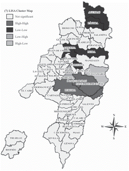 Las características de autocorrelación5 espacial de los procesos migratorios en los municipios del PCC indican que aproximadamente el 18,9% de las migraciones de un municipios se explican por la condiciones de contigüidad geográfica con otros municipios que también tiene presencia de procesos migratorios similares. En ese sentido, las particularidades de una subregión en materia económica y social, se pueden ver reflejadas en las disparidades regionales y las condiciones que promueven la expulsión o en el sentido contrario la atracción poblacional, y en esta lógica se acentúa especialmente el crecimiento conurbado de las ciudades. En la gráfica 3b se advierten los clúster regionales según la migración neta para cada municipio, donde se muestra en un tono más oscuro las regiones. que más pierden población y en un gris más claro los lugares donde se da más concentración.