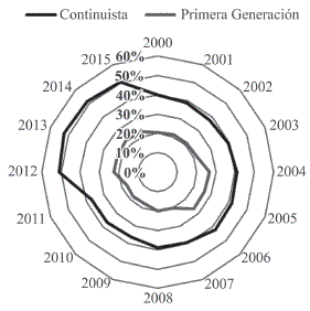 Con base a los objetivos perseguidos, la información de "Continuistas" y "Primera Generación" son reducidas a índices resumen como porcentajes y medias, los cuales son representados mediante gráficos y tablas de contingencia.