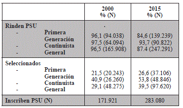 Los datos informan (Tabla 1) que en el año 2015 se inscribieron para participar del proceso de admisión cerca de 280 mil estudiantes, en su mayor parte (72%) pertenecientes a la promoción del mismo año. Del contingente de estudiantes recientemente egresados de la enseñanza secundaria, un 98,6% inscribe la PSU. Un conjunto de medidas de política educativa pro inclusión implementadas por el Estado de Chile han hecho de este test un instrumento de aplicación prácticamente universal, convirtiéndolo en un rito naturalizado y habitual que se cumple finalizada la enseñanza secundaria. Dichas medidas han venido a revertir la constante merma de estudiantes inscritos que para el año 2000 apenas alcanzaba al 66,3% de la promoción del año.