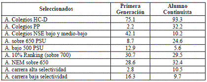 El estudiante "Primera Generación" proviene principalmente de colegios subsidiados por el Estado, sea de naturaleza pública o privada (97,8%), pertenecientes a los segmentos socioeconómicos de menores ingresos. El 42,1% cursó su enseñanza media en colegios dónde el alumnado se caracterizaba por tener padres que no completaron la enseñanza media, registrando una escolaridad que en promedio no supera los 10 años de estudio; pertenecen, además, a familias de bajos ingresos con rentas del hogar que no superan los 472 U$ aprox., y a escuelas dónde más del 50% del alumnado se encuentra en condición de vulnerabilidad social. Este perfil dista significativamente del alumno Continuista, el cual se define respecto de sus atributos socioeducativos como un estudiante que proviene mayoritariamente de colegios particulares pagados (32,2%) y que tan solo en un 10,2% desarrolló su enseñanza media en establecimientos que atienden alumnos de bajo nivel socioeconómico y educativo de los padres.
