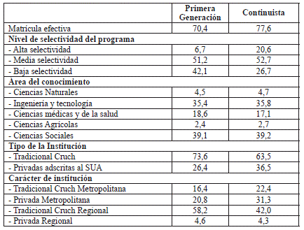 Los datos informan de diferenciales comportamientos de la demanda en las selecciones efectivas con base al atributo del nivel educativo de los padres, en especial, en lo que dice relación al nivel de selectividad del programa elegido, el carácter y tipo de institución. De cada 100 "Primera Generación" seleccionados tan solo un 6,7% lo hace en un programa donde la matrícula histórica recluta a alumnos en su mayoría de alto rendimiento PSU (alta selectividad), cifra que es tres veces mayor en el "Continuista" (20,6%).