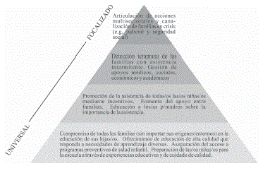Las escuelas de CSCC pueden planificar acciones institucionales que favorezcan el vínculo centro de educación inicial-familiacomunidad. Ejemplo de lo anterior es que las visitas a los hogares se realicen el día destinado al trabajo en contexto, así como designar a algún recurso humano de la escuela que tenga disposición y facilidad para entablar diálogo con las familias, y/o identificar algún referente comunitario que sea nexo ente las familias y la escuela. Consideramos que los centros de EI tienen la oportunidad de contribuir a que las familias encuentren redes de apoyo en otros padres y madres de familia, vecinos y/o trabajadores/as sociales que coadyuven a sostener el proceso educativo de los niños y las niñas, así como fungir a manera de base de seguridad, lo anterior para garantizar la asistencia cotidiana del/os niños/as a la escuela. Los centros educativos pueden establecer coordinaciones con referentes de salud para realizar acciones preventivas ante situaciones sanitarias que afectan la asistencia de las/ os niñas/os a la escuela (con la consecuente repercusión que la misma tiene en el tránsito escolar). Las posibilidades son varias, entre las que sugerimos la organización de charlas informativas y campañas sanitarias: el trabajo multisectorial articulado se torna indispensable. Nuestras propuestas son congruentes con las estrategias delineadas por investigadores de la Universidad de Columbia, a saber: (Figura 1)