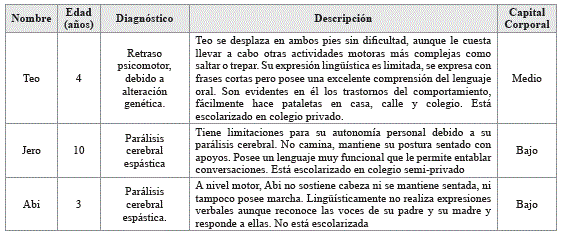 Para poder analizar esta interrelación de fuerzas y capitales, se muestran los casos de tres padres: Mauricio (papá de Teo), John (de Jero) y Manuel (de Abi), desde la perspectiva de sus capitales personales. Se aclara que el capital corporal de los tres es considerado como alto, pues poseen cuerpos sanos, acorde a las expectativas sociales que les permite desempeñarse de manera esperada a nivel corporal. Este capital, a diferencia de los demás, no está en disputa. Sin embargo, el capital corporal de los hijo/as sí marca ciertas diferencias. Solo para orientar un poco al lector, a continuación se describe brevemente los capitales corporales de los niño/as a través de algunas características, físicas, lingüísticas y cognitivas de cada uno tabla 1.