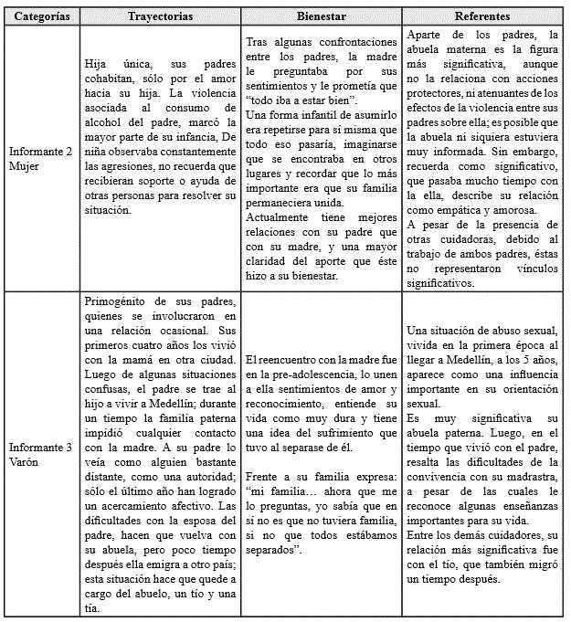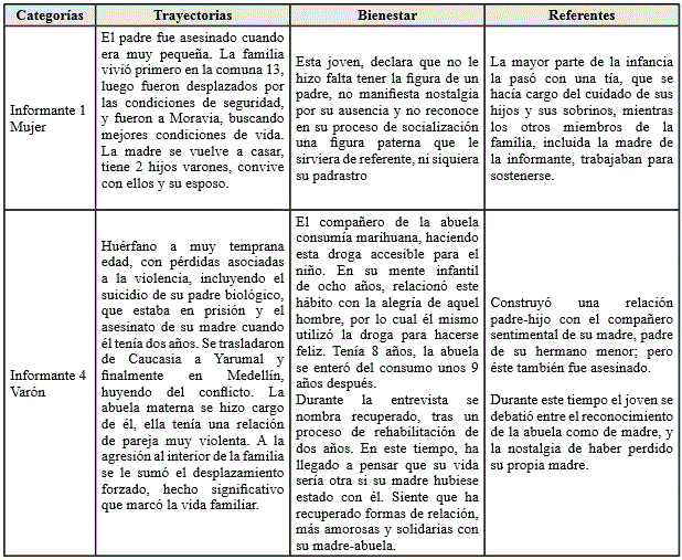 Cada historia familiar ofrece diferentes panoramas relacionales, siendo los relatos sintetizados aquí el efecto de las ausencias, las pérdidas y los abandonos a los que estuvieron expuestos, a la vez que destacan acompañamientos, presencias y apoyos recibidos durante su vida, desde ambos valoran sus vivencias en general, resaltando aquellas que han aportado a la construcción de bienestar. Las dos historias condensadas en la Tabla 1, evidencian como la violencia política y social vivida en el país y la ciudad, han alterado las estructuras familiares, modificando los procesos de socialización durante la infancia y la adolescencia.