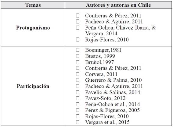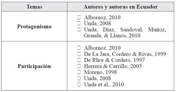 En las producciones de los investigadores e investigadoras en Perú, el tema de la participación está estrechamente ligado al protagonismo infantil. El marco conceptual acerca del protagonismo supone, según Cussiánovich (2001, 2009, 2013), la discusión social, política, cultural y ética acerca de la participación. Con la CDN (1989) se enfatizó el derecho de los niños y niñas como actores de sus propias vidas y, por lo tanto, no se puede pensar en protagonismo sin participación. En el cuadro de abajo se puede ver que los autores y autoras discuten los dos temas en sus producciones.