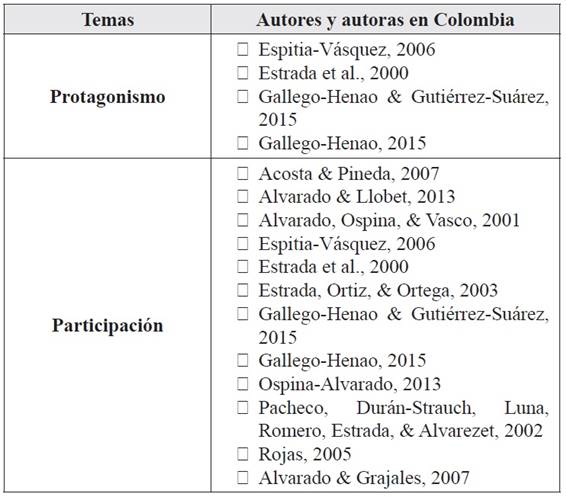 Los artículos de los investigadores e investigadoras en Colombia tratan el tema de la participación con foco en discusiones sobre la participación de niños y niñas de calle, en las instituciones de protección infantil, en temas relacionados con la ciudadanía, en proyectos sociales en busca de paz, y en el mundo social. Los autores y autoras se reseñan en el cuadro de abajo.