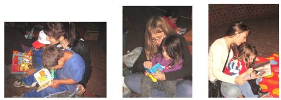 Se disponen al alcance de los niños una serie de recursos (un espacio abierto y una lona para sentarse, linternas, libros de cuentos y adultos que guían las actividades) que a su vez construyen un acceso posible a la narración (leer el libro en ronda y narrar a partir de las ilustraciones).