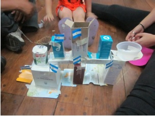 Si analizamos los dibujos y las maquetas que realizó Facundo en la sexta jornada, podemos advertir una vez más la presencia de los mismos elementos. Aun cuando ya había pasado más de un mes de la interacción inicial con Claudia y 15 días desde que se habían proyectado las imágenes, Facundo recreó en sus dibujos y maquetas los mismos elementos: el agua, las escaleras, el cielo y el sol en la figura 4. También, ese día realizó una maqueta (Fotografía 1) en la cual hizo una construcción en elevación con diferentes cajitas de cartón y con banderitas. Podemos interpretar que esta construcción es una transposición del dibujo realizado (figura 1) que, a su vez, reproduce un cuadro de Xul Solar proyectado en la jornada del 24 de octubre. En este cuadro pueden verse casas de colores que se encuentran en altura sostenidos por unos pilotes y escaleras. Las casas se encuentran sobre el agua y están unidas entre ellas por unos cordeles de los cuelgan banderas. Si bien a la maqueta fotografiada le falta el color, podemos observar las banderas que aparecen en el cuadro y la idea de una construcción de torres rectangulares sostenida por pilotes y conectadas entre sí.