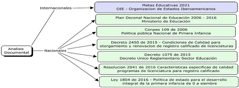 Después de tales políticas se han hecho pronunciamientos nacionales: el Código de Infancia y Adolescencia (Ley 1098) (Congreso de Colombia, 2006), el Plan Nacional Decenal de Educación 2006- 2016 (Ministerio de Educación Nacional, 2006) y el actual Plan Nacional 2016-2026, la Estrategia Nacional de Atención Integral a la Primera Infancia, la política pública nacional «Colombia por la primera infancia» (Conpes 109) (Departamento Nacional de Planeación, 2007), la serie Lineamientos curriculares del preescolar del Ministerio de Educación Nacional (1998), el Sistema Nacional de Formación de Educadores y Lineamientos de Política (Ministerio de Educación Nacional, 2014b), el Decreto único reglamentario 1075 del sector de la educación (Ministerio de Educación Nacional, 2015a), los derechos básicos de aprendizaje para preescolar (Ministerio de Educación Nacional, 2016a) y la Ley 1804, política de Estado para el desarrollo integral de la primera infancia «De cero a siempre» (Congreso de Colombia, 2016). A esta discusión se unen los nuevos lineamientos de calidad para la obtención y renovación de registro calificado, contenidos en el Decreto 2450 (Ministerio de Educación Nacional, 2015a), y la Resolución 2041 (Ministerio de Educación Nacional, 2016b), que formulan lineamientos claves para los programas de formación de maestros.