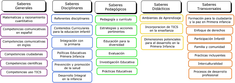 Por otro lado se pueden diferenciar entre los retos para la formación del maestro de primera infancia, ciertos saberes pedagógicos, definidos por Morales et al. (2010) como una construcción propia de cada sujeto, que surge «como resultado de las interacciones entre sus disposiciones internas y el contexto cultural y social de manera activa y participativa; esto le permite organizar, interpretar y reestructurar el conocimiento con la experiencia, los saberes previos y la información que de diversas fuentes recibe» (p. 51). La formación de estos saberes, por tanto, no se reducen a los contenidos curriculares de un programa de formación, si no que ha de proveerse las oportunidades de aprendizaje en un ejercicio activo con la realidad.
