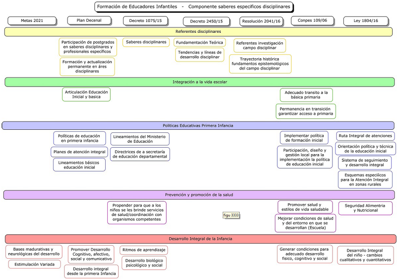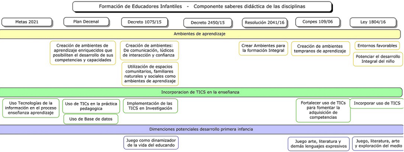 Aun cuando las políticas no expresan necesariamente de manera explícita cuáles son los saberes específicos en que se debe formar el educador infantil, el análisis hecho permitió reconocerlos a partir de los retos que suponen dichas políticas. Una de las dimensiones emergentes fueron los saberes disciplinares, los cuales muestran saberes particulares claves con respecto a los docentes de otras disciplinas. Por un lado, la demarcación de estos saberes está relacionada íntimamente con la posibilidad de enseñabilidad de una disciplina, pero en la educación infantil, estos referentes disciplinares presentan bordes más difusos. Investigaciones como la de Morales-Saavedra, Quilaqueo- Rapimán y Uribe-Sepúlveda (2010) estudiaron los saberes disciplinares del educador infantil, desde la perspectiva el maestro, encontrando un énfasis en las neurociencias, los factores genéticos, el desarrollo emocional y motriz en los primeros años del ser humano, elementos en común con las políticas analizadas.