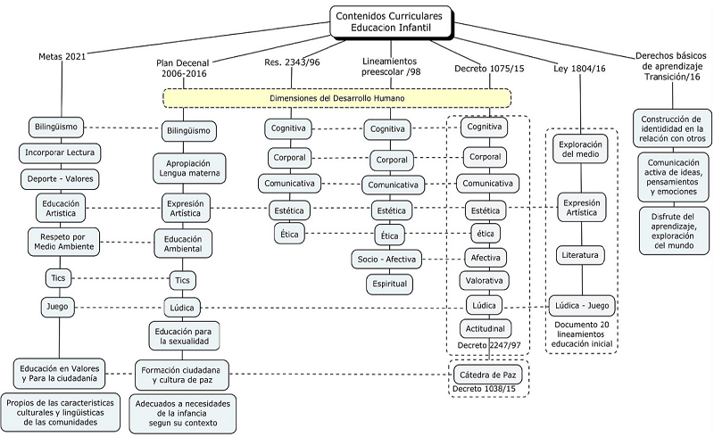 La Resolución 2343 de 1996, que establece para la educación primara y básica, indicadores de logros fijados a partir de áreas obligatorias y fundamentales definidas en la Ley 115 (Congreso de Colombia, 1994), y determina para preescolar indicadores formulados desde las dimensiones del desarrollo humano: corporal, cognitiva, comunicativa, estética y ética.