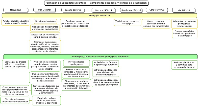 En el eje «Pedagogía y currículo» se retoma el propósito de los países iberoamericanos en las Metas 2021 de ampliar y garantizar el carácter educativo de la educación infantil, de modo que las acciones pedagógicas constituyan un eje fortalecedor del desarrollo. La Ley 1804 establece la importancia de operar de acuerdo con los referentes conceptuales, pedagógicos y metodológicos mediante procesos intencionales, estructurados y pertinentes, a lo que el Decreto 1075 sugiere orientar el currículo para primera infancia a promover un desarrollo integral y multidimensional que responda a las necesidades formativas de la infancia, de acuerdo con su contexto. Para el Plan Decenal dichos aspectos curriculares deben ser adecuados, flexibles y encaminados hacia la primera infancia, en tanto que el Conpes 109 señala que los modelos y las mediaciones pedagógicas deben responder al propósito de construir propuestas curriculares dirigidas a la formación integral, desde un enfoque por competencias.