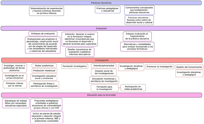 Para las políticas estudiadas, el educador infantil debe formarse en referentes pedagógicos, conocer los estándares curriculares de educación inicial, hacer las adecuaciones que permitan reconocer las características particulares de los niños y niñas, saber integrarlas a su proceso de aprendizaje, formular estrategias, proyectos y acciones pedagógicas pertinentes, propugnar la inclusión y la superación de las barreras de aprendizaje, crear prácticas pedagógicas innovadoras que pongan a la escuela como centro de desarrollo social y cultural, y formular acciones de evaluación, más allá de su carácter probatorio, que permitan apreciar los avances en el desarrollo integral del niño, sus necesidades y mejoramiento de la práctica educativa.