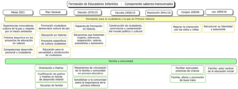 Incluye los saberes que forman parte fundante y transversal de la cotidianidad del maestro y traspasan los demás saberes en su práctica (figura 7). Las políticas coinciden en la importancia de construir espacios de formación en valores, promover el respeto, la tolerancia, la cooperación, la autoestima, y que apunten hacia la democracia y una cultura de paz; la formación en ciudadanía y la paz desde la primera infancia pretenden enriquecer los procesos de aprendizaje y de interacción social en los que se logren el reconocimiento de identidades y el fortalecimiento de la autonomía. A la vez, se reconocen las acciones pertinentes para ofrecer orientación efectiva y mecanismos de participación a la familia y la comunidad en los procesos educativos que permitan sensibilizarla hacia la importancia de propiciar un desarrollo integral desde la primera infancia.