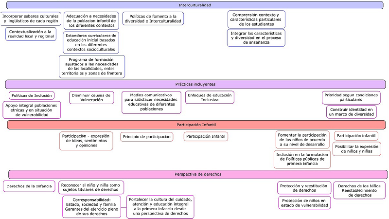Por su parte, en el eje «Interculturalidad» se destaca la incorporación de los saberes culturales y lingüísticos de cada región que presenten un enfoque contextualizado y la adecuación a las necesidades de la población infantil. Esto último resuena en las prácticas incluyentes como mecanismo que garantice la integración de las comunidades étnicas (Metas 2021), la disminución de la violencia y la vulneración de los derechos (Plan Decenal), la integración de medios de comunicación alternativos (Decreto 1075), de modo que se logre priorizar y satisfacer las necesidades particulares de cada grupo social, en la medida en que se vaya construyendo una identidad en un marco de diversidad y respeto a la diferencia (Ley 1804).