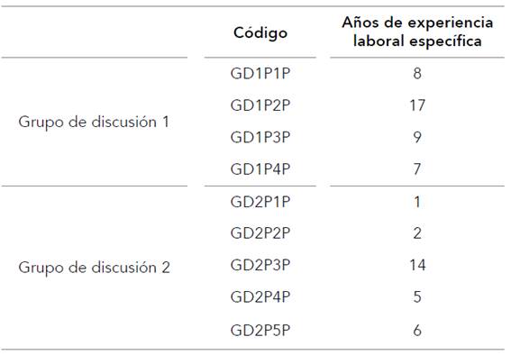 Los resultados de la fase anterior fueron puestos a disposición de las figuras profesionales en dos grupos de discusión, celebrados en septiembre y octubre del 2016 (tabla 2). Esta técnica permite conocer, de un modo intensivo, las percepciones sobre el problema objeto de estudio. Los grupos están abiertos a todo tipo de opiniones, independientemente de su naturaleza (Báez, 2007), para lo cual se promueve un ambiente en el que las opiniones surjan de forma natural. Elegimos una propuesta metodológica secuenciada, que posibilita una triangulación diferida que, mediante la utilización de diferentes técnicas, facilita la configuración de categorías que representan fenómenos significativos para las personas que participan (Strauss & Corbin, 2002). Los grupos de discusión estuvieron compuestos por educadores y educadoras sociales que prestan acompañamiento socioeducativo en el tema de recursos de protección. El proceder metodológico, de naturaleza dinámica y flexible, resulta especialmente apropiado para contextos de naturaleza singular, cuya transferibilidad es posible en realidades con condiciones y características similares (San Martín, 2014). Avanzamos hacia una teorización sustantiva, propia de la teoría fundamentada.