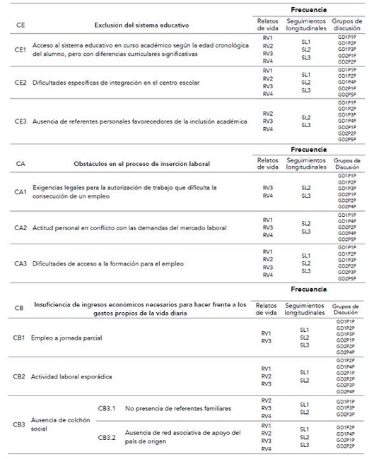 A su llegada, la juventud de origen latinoamericano se encuentra con una barrera que supondrá una dificultad decisiva en su proceso de emancipación: el acceso a un sistema educativo rígido que no tiene en cuenta los factores sociales y que trata a todo el alumnado con un falso igualitarismo, olvidando que la realidad personal de cada estudiante es diferente. Esta situación se traduce en la vivencia de procesos de exclusión académica: «me metieron en un curso en el que no me enteraba de nada: hablaban de cosas que yo nunca había estudiado», manifiesta una joven (RV2). «Si a las dificultades existentes de integración en la escuela le sumas que metes al chico en un curso para el que no tiene nivel académico suficiente, ya tienes la fórmula perfecta para que se produzca el fracaso escolar», dice un educador (GD1P2P). Se constata la ausencia de figuras de referencia que promuevan la inclusión en el ámbito educativo; el propio entorno relacional presenta dinámicas que chocan con las demandas escolares (SL1, SL2).