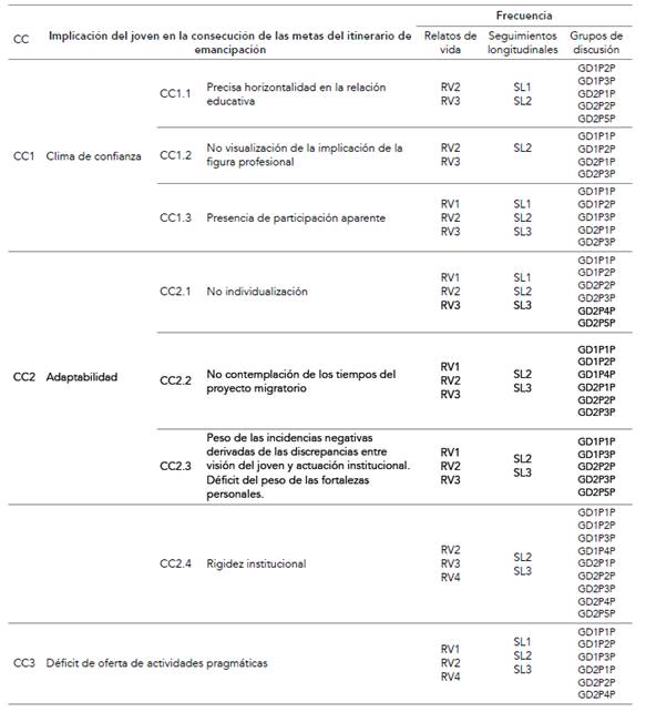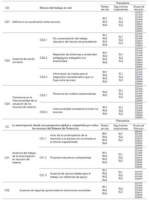 En España, el Sistema de Protección a la Infancia y a la Adolescencia tiene pendiente realizar profundas mejoras en la atención que brinda a la juventud no nacional en dificultad social (tabla 5). La permanencia de modelos asistencialistas en los recursos de protección potencia una contradicción en la formas de pedagogía que ponen en práctica los equipos. En este sentido, se observa que los jóvenes que transitan por recursos actúan de forma contradictoria (SL1, SL2, SL3). «En los centros te dicen cosas muy diferentes, según el centro del que se trate. Hasta que creces no te das cuenta de quién tenía razón», comenta un joven (RV1E1). «Varias veces he insistido en la conveniencia de trabajar la emancipación, pero trabajamos desde la sobreprotección. Algunas compañeras comparten lo que digo, pero manda quien manda», dice una educadora (GD2P5P). Sería conveniente que la transición a la vida adulta fuera un objetivo prioritario para todos los equipos del Sistema de Protección. La situación en la que se emancipa la juventud en dificultad es la muestra de la eficiencia de su actuación.