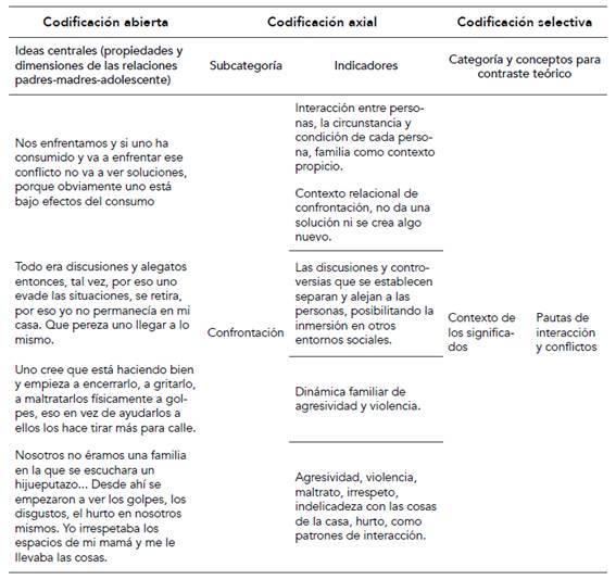 El método hermenéutico fue el vehículo y vínculo del que se dispuso para lograr un proceso de comprensión y acercamiento directo con los padres, madres y adolescentes desde su propio sentir y pensar. Teniendo presente el número de familias que aceptaron ser informantes (cuatro), se llevaron a cabo entrevistas a profundidad bajo los criterios de la teoría fundamentada (Strauss & Corbin, 2002), y se realizó la recolección, codificación (abierta, axial y selectiva; véase tabla 1) y el análisis de datos. Tanto el registro como el procesamiento de la información fueron manejados en el software para análisis de datos cualitativos Atlas.ti 7™ (Muñoz & Sahagún, 2017).