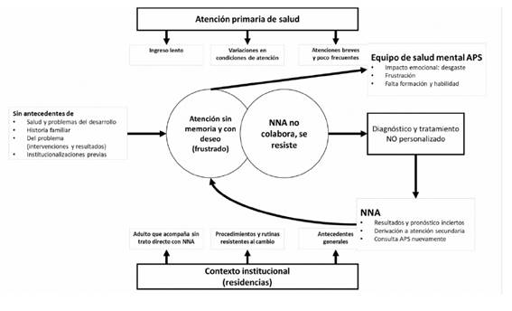 Los resultados anteriormente presentados responden a la interrogante acerca de las experiencias y necesidades percibidas subjetivamente por los equipos de salud en la práctica directa de atención estos NNA institucionalizados. La atención es percibida como parcializada y discontinua, con falta de antecedentes del NNA, su familia y su historia, lo que limita la comprensión del caso y el diseño de un tratamiento adecuado. Los equipos de APS reconocen la complejidad psicopatológica y, especialmente, los aspectos psicosociales involucrados en la atención de los pacientes. Los tratantes aluden a la complejidad y desgaste en este tipo de atenciones, a la necesidad de especialización para trabajar con este grupo específico y a las problemáticas éticas asociadas a un tratamiento escasamente eficiente.