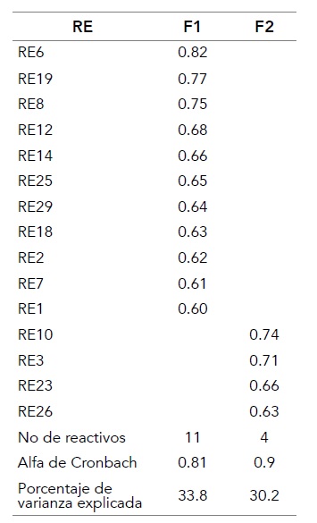 El modelo factorial final, con un índice KMO =0.90 y prueba de esfericidad de Bartlett significativa (X2 = 1671.113, gl = 148, p<0.001), con comunalidades superiores a 0.50, conformó dos dimensiones que explican el 64 % de la varianza. Los autovalores encontrados van de 6.8 a 1. La carga factorial menor de los reactivos fue de 0.50 y la mayor de 0.77.