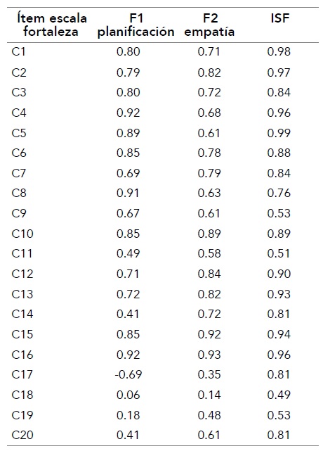 La validación convergente se llevó a cabo al correlacionar las dimensiones del cuestionario de resiliencia ajustado para dos factores 15 ítems con la escala fortaleza de carácter, donde se obtuvieron correlaciones significativas en el nivel .01 para todas las dimensiones. No obstante, los ISF son muy bajos (<0 .70) en C11, C18, C19, pese a correlaciones interfactoriales moderadas (tabla 2), lo que indicaría que estos ítems no son influidos predominantemente por su factor teórico.