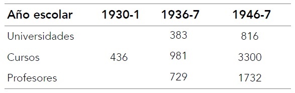 Los clubes escolares panamericanos se transformaron en populares actividades extra-curriculares. Ya para 1933, en el estado de New York, se contaron 40 clubes estudiantiles dedicados a los estudios e intercambios interamericanos. Durante el periodo de actividad de aquella división de la Unión Panamericana, se puede apreciar un aumento notable en la cantidad de universidades que ofrecían cursos sobre América Latina (tabla 1). La publicación del Manual para Estudiantes y Maestros para el Día de las Américas incluía cada año más ejemplares de los programas curriculares y actividades cívicas llevadas a cabo en las primarias y secundarias de los Estados Unidos. En su contenido, las pruebas y tareas publicadas dieron primacía a materias económicas; todo el conocimiento que promovían era sobre los productos y recursos naturales de los países latinos. No hubo ninguna pregunta en las pruebas sobre la producción agrícola de los Estados Unidos (Pan American Union, 1947). Así, se reforzaba, dentro de la retórica amigable del Buen Vecino, el imaginario de las dos Américas: una industrial y otra (otras varias) productora, con un toque de encanto artesanal. Desde la perspectiva de los Estados Unidos, el material curricular publicado por la Oficina de Intercambio Intercultural rindió los resultados esperados: la creación de una generación de jóvenes con interés en los idiomas, las culturas, la geografía, las tradiciones y, sobre todo, las materias primas de la región de América Latina, así como con los vehículos institucionales para satisfacer sus curiosidades.