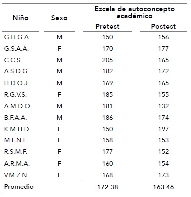 Los resultados en la prueba de autoconcepto académico mostraron que nueve niños reportaron estimaciones más bajas al finalizar la instrumentación del programa y cuatro aumentaron. Los cambios encontrados en los puntajes de autoconcepto académico (M pre= 172.38, D. E.=15.798; M post=163.46, D. E.=15.904) mostraron una disminución entre la primera y la segunda evaluación a nivel grupal y con la prueba no paramétrica de Wilcoxon se observó que las diferencias (Z= -1.399, sig. = 0.162), no fueron estadísticamente significativas (tabla 1).