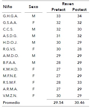 En la evaluación de la inteligencia se emplearon dos instrumentos: el Test de matrices progresivas Raven, forma coloreada y la Escala Wisc-IV. En primer lugar, se analizó si existían diferencias significativas entre los puntajes obtenidos en la prueba Raven; como se observa en la tabla 2, hubo un incremento en las puntuaciones de siete niños, así como en el puntaje promedio por grupo. Con la prueba de Wilcoxon se observó que estas diferencias no fueron significativas (Z= -1.083, sig.= 0.279) entre la primera aplicación (M pretest= 29.54, D. E.= 2.066) y la realizada después del programa de enriquecimiento (M= 30.46, D. E.= 2.025).