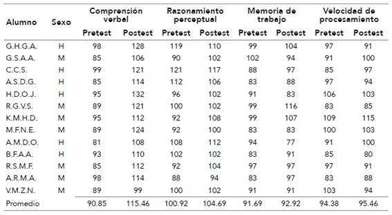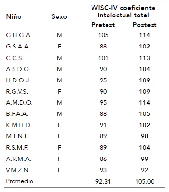 En los resultados del Wisc-IV se observó un incremento en los niveles mostrados de los puntajes obtenidos en el coeficiente intelectual total entre la primera evaluación (M pretest= 92.31, D. E.= 5.498) y la segunda (M postest= 105.00, D. E.= 6.658). Con la prueba de Wilcoxon se encontró que hubo diferencias estadísticamente significativas entre las dos mediciones (Z= -3.116, sig.= .002). Cabe mencionar que, a nivel individual, de los trece niños que participaron en el programa, doce lograron incrementar su coeficiente intelectual total al finalizar la intervención educativa (tabla 3).