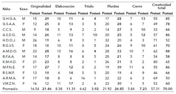Para evaluar los cambios en los niños en el área de creatividad después del programa Programando-ando se utilizaron el Test de pensamiento creativo de Torrance en su versión figural A (Torrance, 2008) y en su versión verbal A (Torrance, 1998). En la tabla 5, se presentan los datos obtenidos por los niños en la primera de dichas pruebas. Se analizaron las puntuaciones medias obtenidas en ambas evaluaciones (pretest y postest) con los cuales se encontraron incrementos en los indicadores originalidad, elaboración, fluidez y cierre, así como en el puntaje total. En el caso de los títulos se observó un decremento.